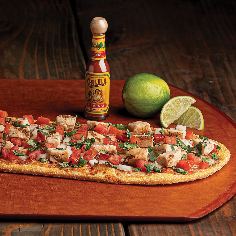 Signature Garlic White Sauce on our Tuscany Thin Crust, topped with Mozzarella Cheese, All-Natural Grilled Chicken, Bacon Bits, Jalapeños, Fresh Tomatoes, Red Onion, and a Chipotle Sauce drizzle.