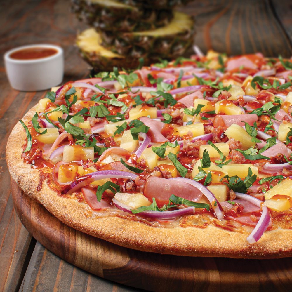 Signature Red Tomato Sauce on our Original Crust, topped with extra Mozzarella Cheese, Canadian Bacon, and Juicy Dole Pineapple.